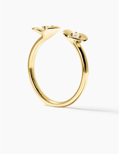 La bague L'Hortensia Ouverte dorée se distingue par son anneau ajustable, dont les deux extrémités s'épanouissent chacune en un motif floral. Deux fleurs qui se font face, chacune sertie d'un oxyde de zirconium blanc au cœur des pétales, comme deux éclats de lumière en dialogue.